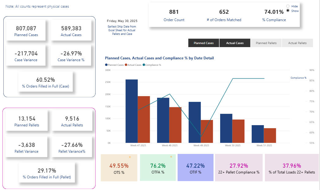 margin per load, on-time delivery, carrier scorecards, and appointment compliance.